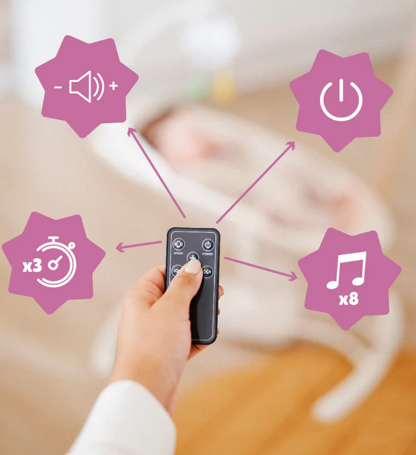 Si spre bucuria bebelușului tau (si a ta), leaganul canta si melodii blande si linistitoare. Pur si simplu utilizati functia din lateral pentru a selecta unul dintre cele 8 cantece de leagăn si reglati volumul.