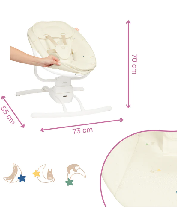 Un leagan confortabil care imita bratele calde ale mamei! Fie ca este vorba de linistirea, leganarea sau distractia bebelusului, leaganul vine cu o gama larga de functii extrem de utile pentru parinte si pentru bebelus.