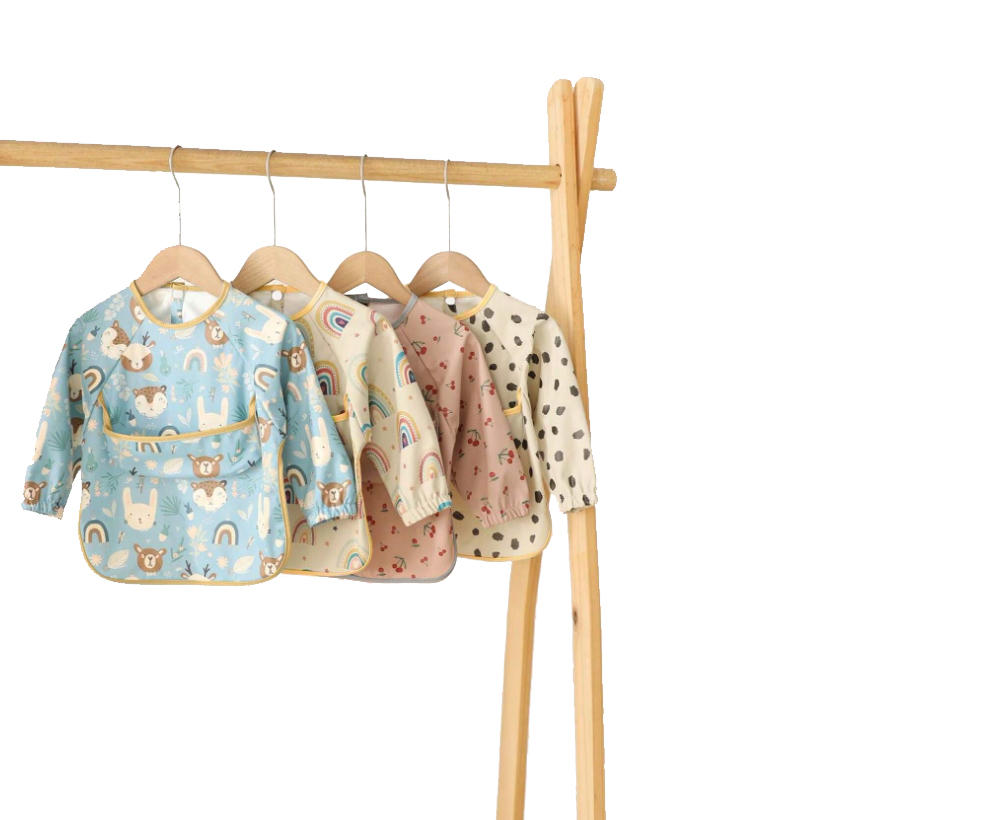 Bavetă impermeabilă pentru fetițe cu model picățele. Această bavetă cu mâneci nu va permite ca mâncarea să murdărească hăinuțele copilașului. Ușor de folosit și de spălat.