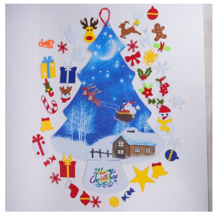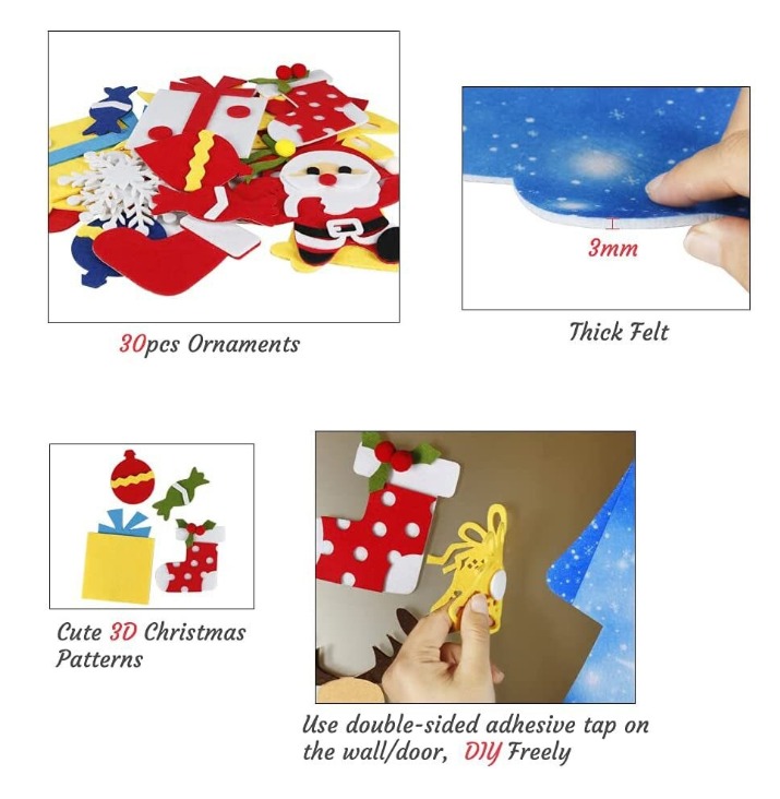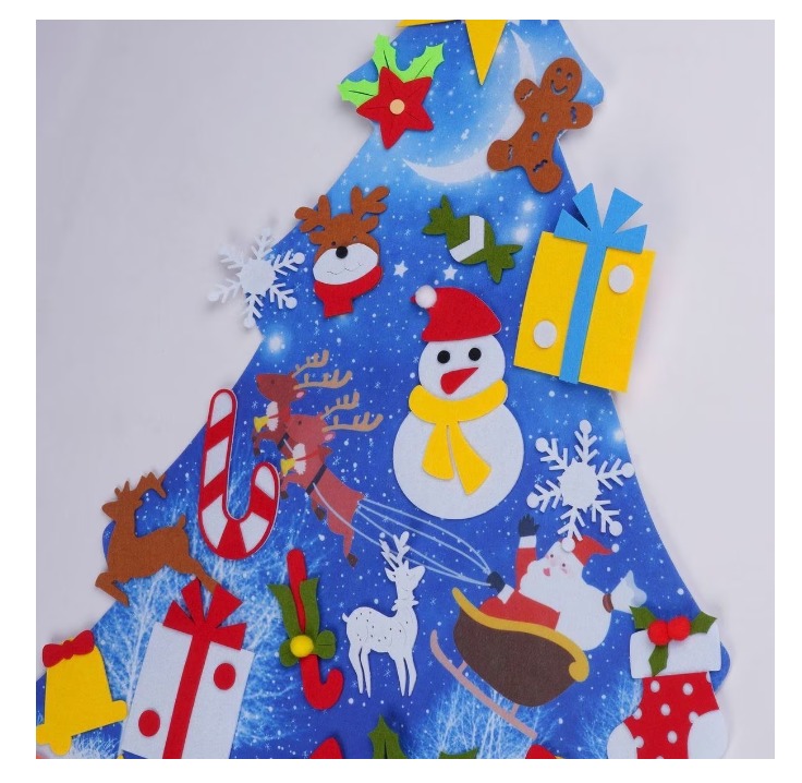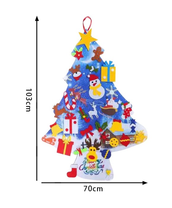 Bradul de Craciun este fabricat din pasla de inalta calitate, un material usor si sigur pentru copii. Fara elemente care ar putea prezenta pericol de sufocare sau ranire. Inaltimea de 103 cm si latimea de 70 cm ofera suficient spatiu pentru ca micutii sa isi exerseze abilitatile motorii fine si sa invete despre forme, culori si simbolurile specifice Craciunului.