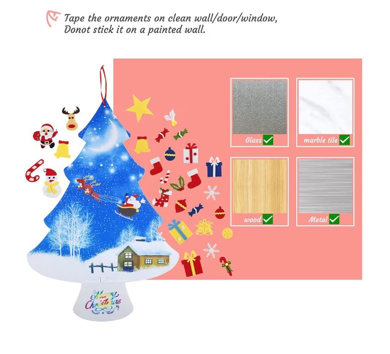 Bradul este echipat cu un pandantiv special care permite agatarea acestuia pe perete, oferind astfel o modalitate practica de a-l expune si de a-l integra in decorul casei. In plus, ornamentele se fixeaza cu ajutorul unor bucati de velcro, fiind usor de atasat si detasat. Acest sistem simplu de fixare face ca bradul sa fie usor de utilizat chiar si de catre copiii mai mici.