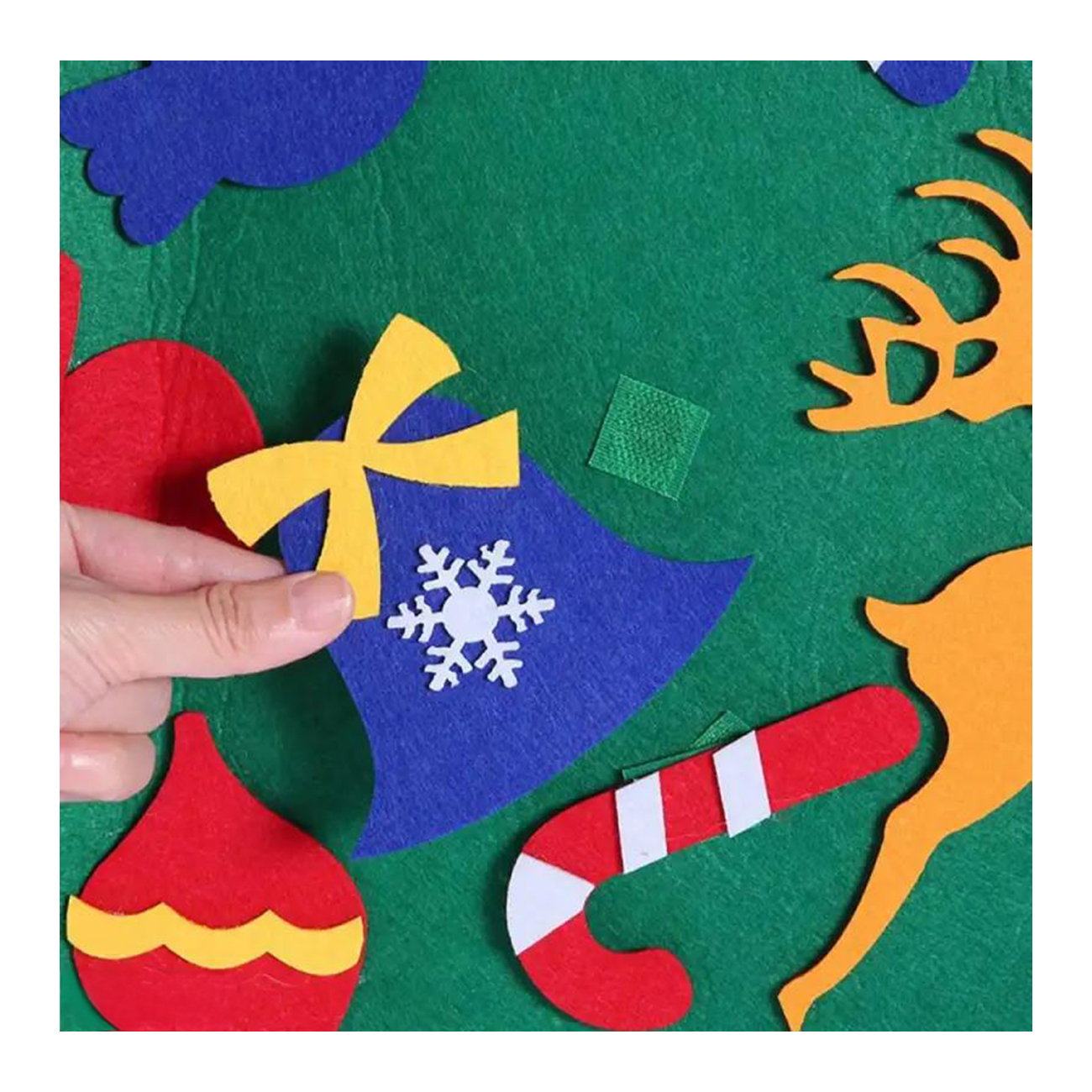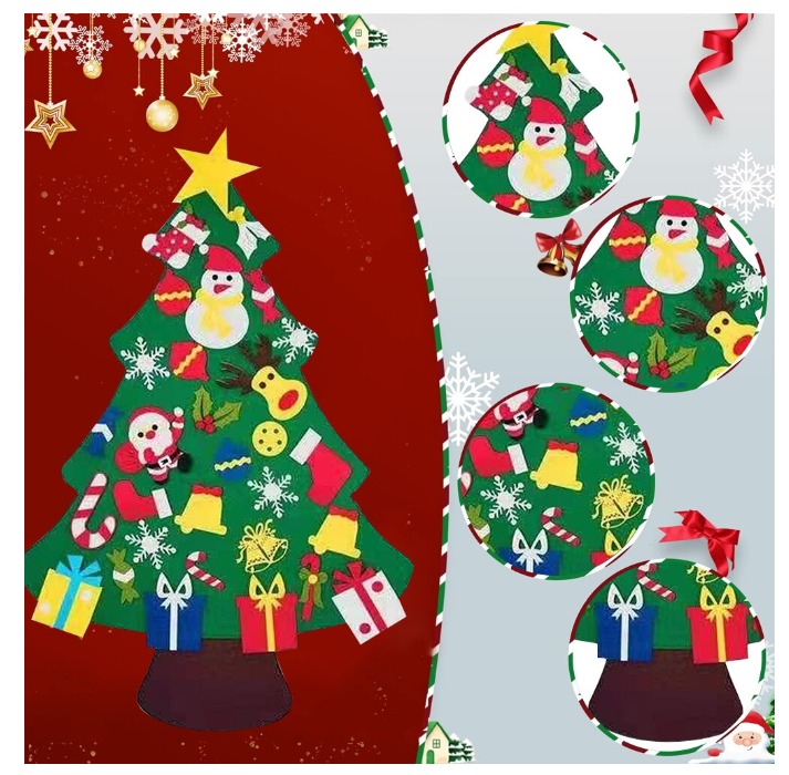 Bradul de Craciun este fabricat din pasla de inalta calitate, un material usor si sigur pentru copii. Fara elemente care ar putea prezenta pericol de sufocare sau ranire. Inaltimea de 100 cm si latimea de 70 cm ofera suficient spatiu pentru ca micutii sa isi exerseze abilitatile motorii fine si sa invete despre forme, culori si simbolurile specifice Craciunului.