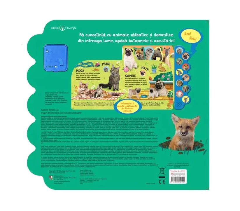 Cartea educativa „Bebe Invata Animale” este perfecta pentru micutii exploratori cu varsta intre 0 si 3 ani. Aceasta carte interactiva cu sunete le ofera copiilor o modalitate captivanta de a descoperi animalele salbatice si domestice din intreaga lume. Fiecare pagina a cartii prezinta o noua aventura, cu imagini atragatoare si sunete reale care aduc la viata lumea animalelor.
