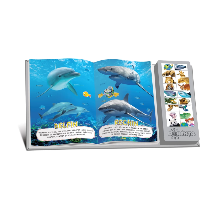 Cartea le prezinta copiilor o varietate de animale din toate colturile lumii – de la tigri, lei, girafe si elefanti, pana la rechini, delfini si pasari exotice. Fiecare animal este ilustrat in detaliu si insotit de informatii interesante, scrise intr-un limbaj simplu si accesibil.