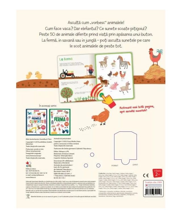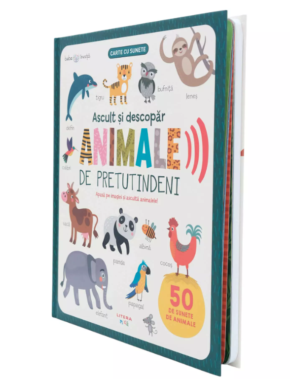 Aceasta carte le permite celor mici sa invete despre diferite animale din toata lumea. La ferma, in savana sau in jungla, copiii vor descoperi sunetele specifice fiecarui animal. Prin simpla apasare a butoanelor, acestia vor auzi cum face vaca, elefantul, cocosul si multe alte animale. Aceasta combinatie de imagini colorate si sunete captivante ii ajuta pe copii sa faca asocieri vizuale si auditive, stimuland astfel dezvoltarea cognitiva.