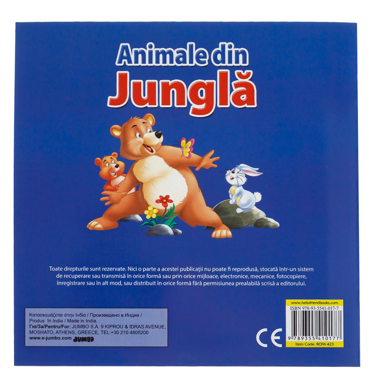 Cartea "Animale din Jungla" are 16 pagini, oferind o experienta de lectura scurta si placuta, perfect adaptata atentiei copiilor. Dimensiunile cartii sunt de 30x23.5 cm, ceea ce o face usor de manevrat si perfecta pentru a fi citita impreuna cu parintii sau educatorii. Formatul generos permite copiilor sa se bucure de detaliile ilustratiilor, facand experienta de lectura si mai placuta.