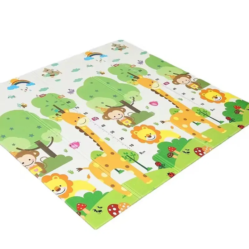 Covor pliabil de joaca - dispune de imprimeuri colorate, fata-verso, care sunt atat distractive, cat si educationale. Pe o parte a covorasului se regaseste un design cu animale din padurea de basm, cum ar fi girafe, maimute si lei, insotite de un grafic pentru masurarea inaltimii, astfel incat parintii sa poata urmari cresterea copilului. Cealalta parte prezinta un labirint captivant si diverse ilustratii ce incurajeaza imaginatia si jocul creativ. Aceste imprimeuri vibrante fac covorasul potrivit si ca element decorativ in camera copilului.