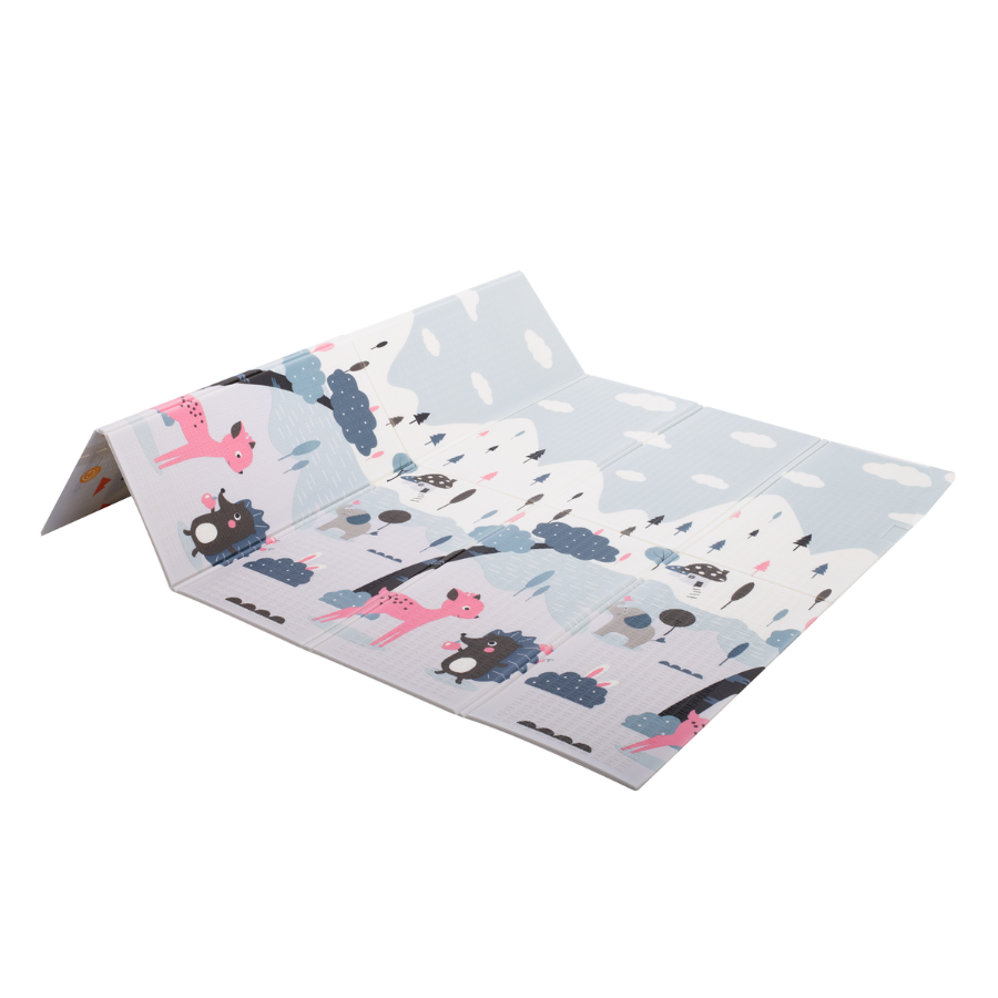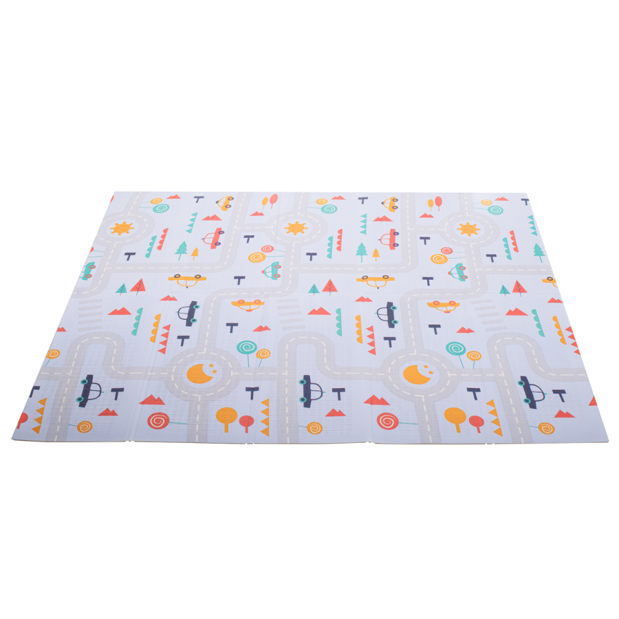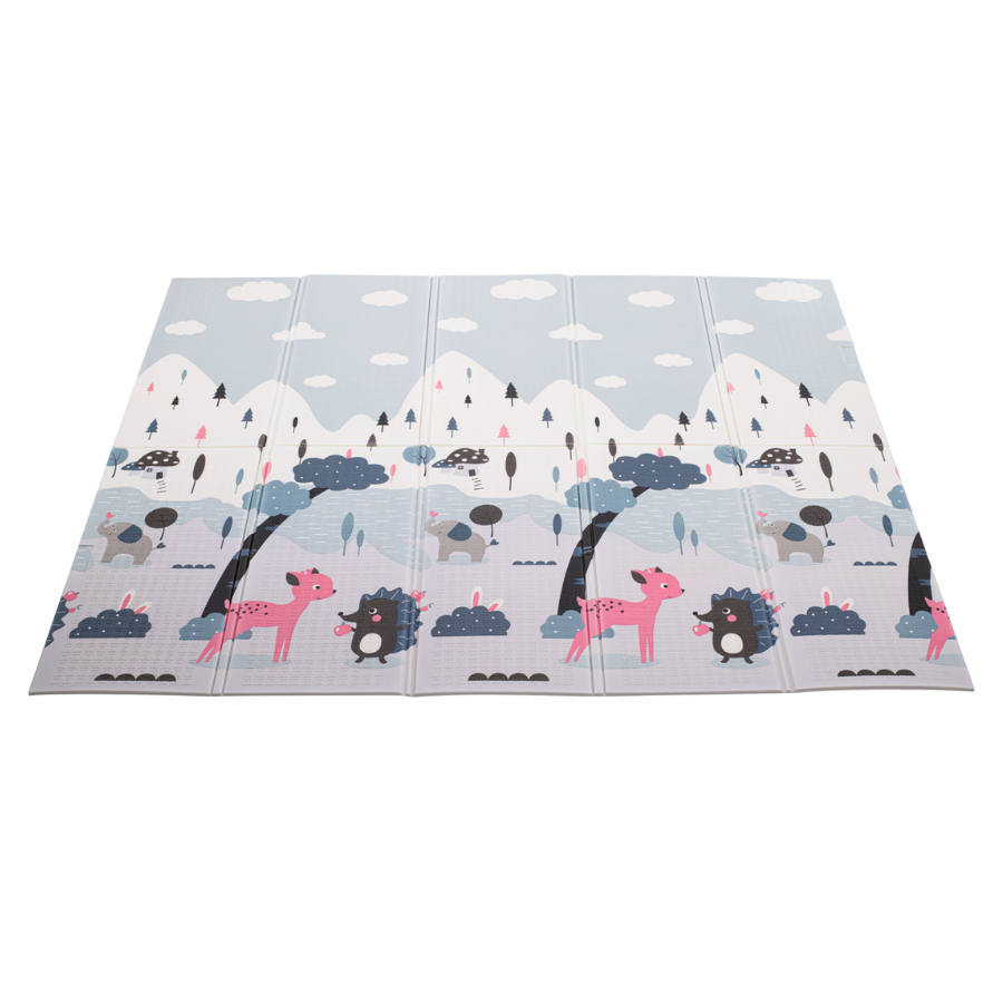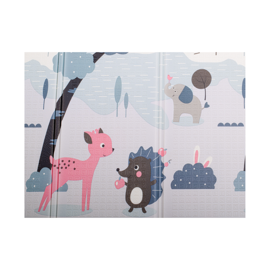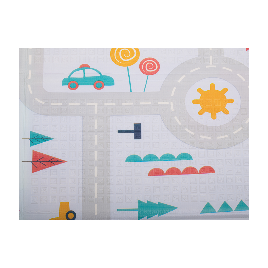 Unul dintre cele mai atractive aspecte ale acestui covor pliabil educational este designul sau dublu. Pe o parte, copiii se pot bucura de o scena din padure, cu animale simpatice precum arici, iepurasi si caprioare, iar pe cealalta parte, descopera un orasel plin de stradute, semne de circulatie si masini colorate. Astfel, cei mici pot invata despre natura si regulile de circulatie in acelasi timp, prin jocuri interactive.