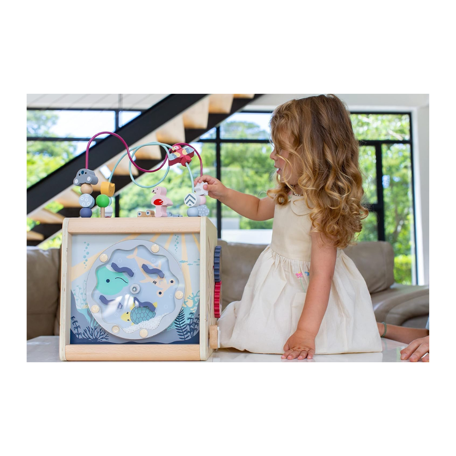 Fiecare latura a cubului ascunde o noua provocare si o oportunitate de invatare. Copiii pot interactiona cu labirinturi colorate, piese mobile, numere, animale, roti dintate si alte elemente educative menite sa le dezvolte coordonarea mana-ochi, motricitatea fina si gandirea logica. Partea superioara este dotata cu un traseu din sarma cu margele din lemn, perfect pentru exersarea dexteritatii.