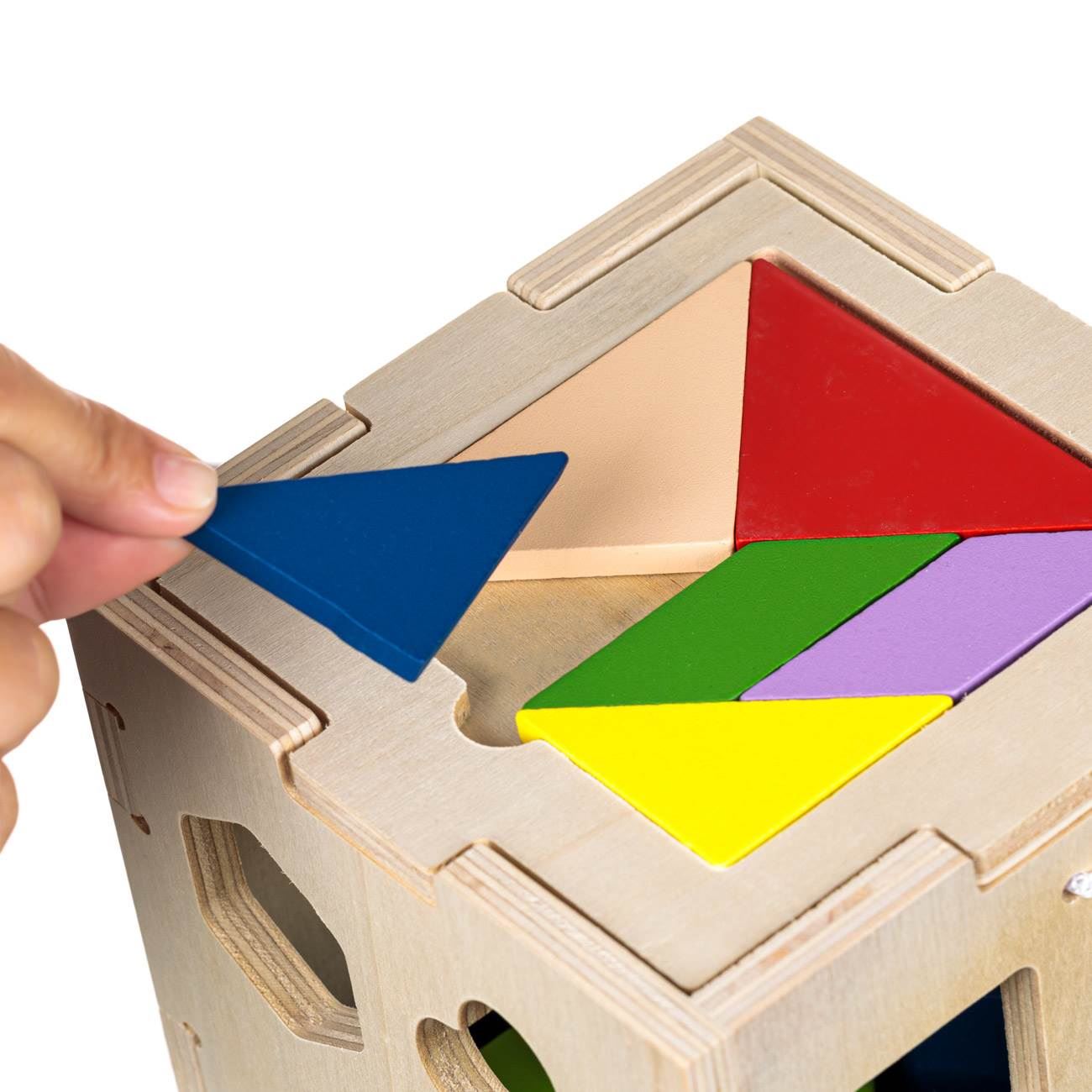 Aceasta jucarie educativa are un design simplu si eficient. Cubul din lemn are dimensiunile de 14x14x14 cm. Oferind o structura compacta si usor de manevrat de catre copii. Pe partile laterale ale cubului se gasesc 12 decupaje in forme geometrice diferite. Fiecare fiind insotit de o piesa de lemn colorata care se potriveste perfect in respectivul decupaj. Copiii pot incerca sa introduca fiecare piesa in locul potrivit, exersand astfel coordonarea mana-ochi si recunoasterea formelor.