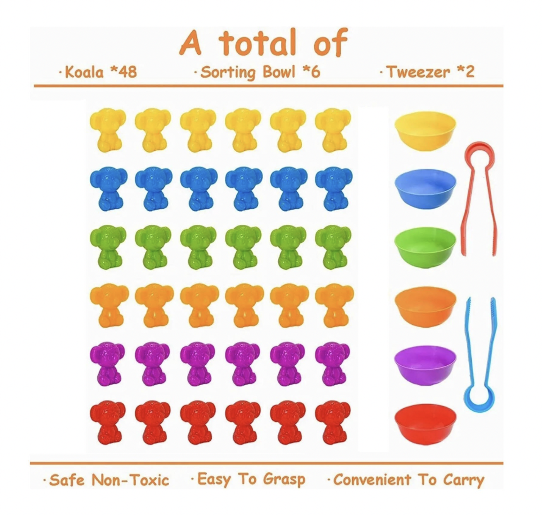 Acest joc educativ de numarat este perfect pentru a ajuta copiii sa invete concepte de baza ale matematicii intr-un mod distractiv si captivant. Cu ajutorul figurinelor colorate si a bolurilor de sortare, cei mici vor invata sa recunoasca si sa sorteze culorile, dezvoltandu-si in acelasi timp abilitatile cognitive si motorii fine.