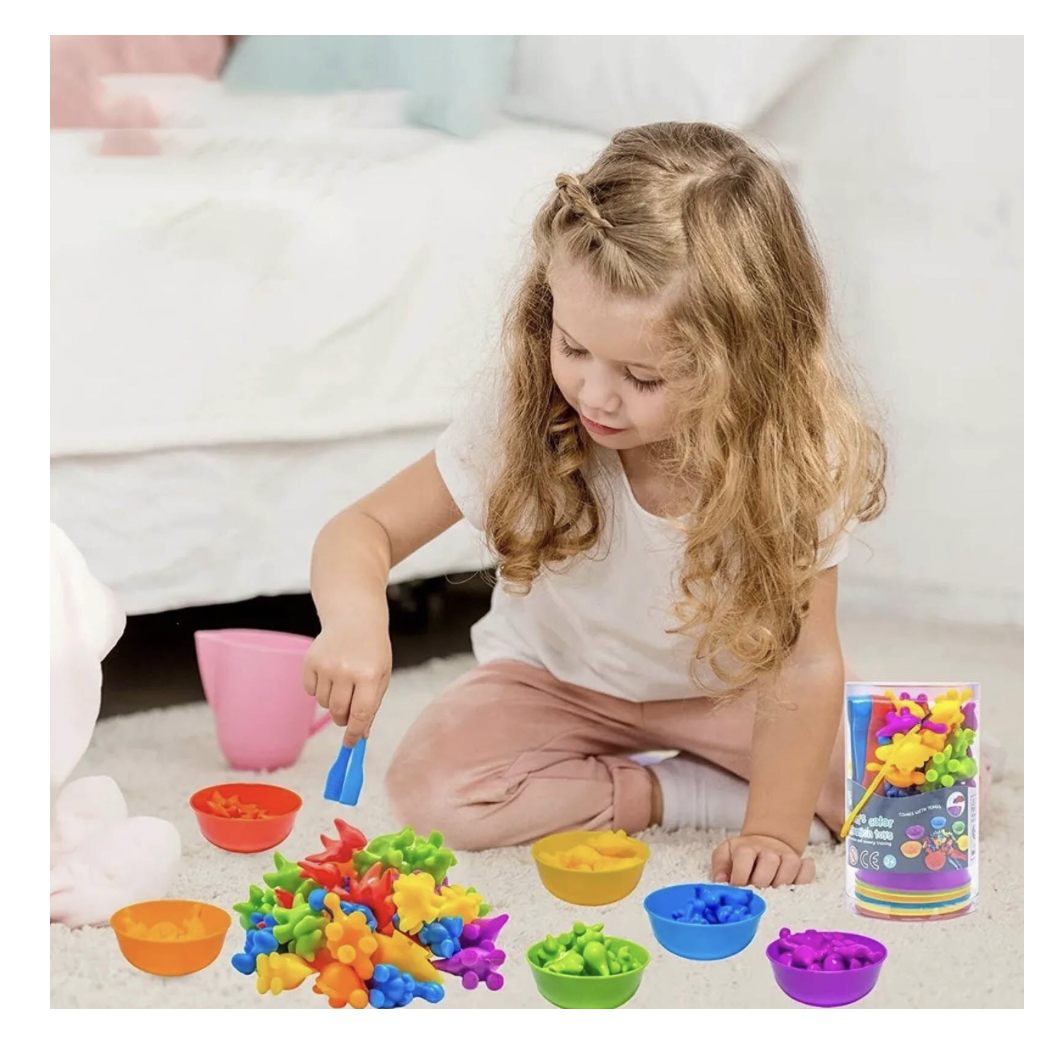 - Dezvoltarea abilitatilor motorii fine – Copiii vor folosi pensetele incluse pentru a separa si sorta figurinele, imbunatatindu-si dexteritatea si coordonarea mana-ochi.