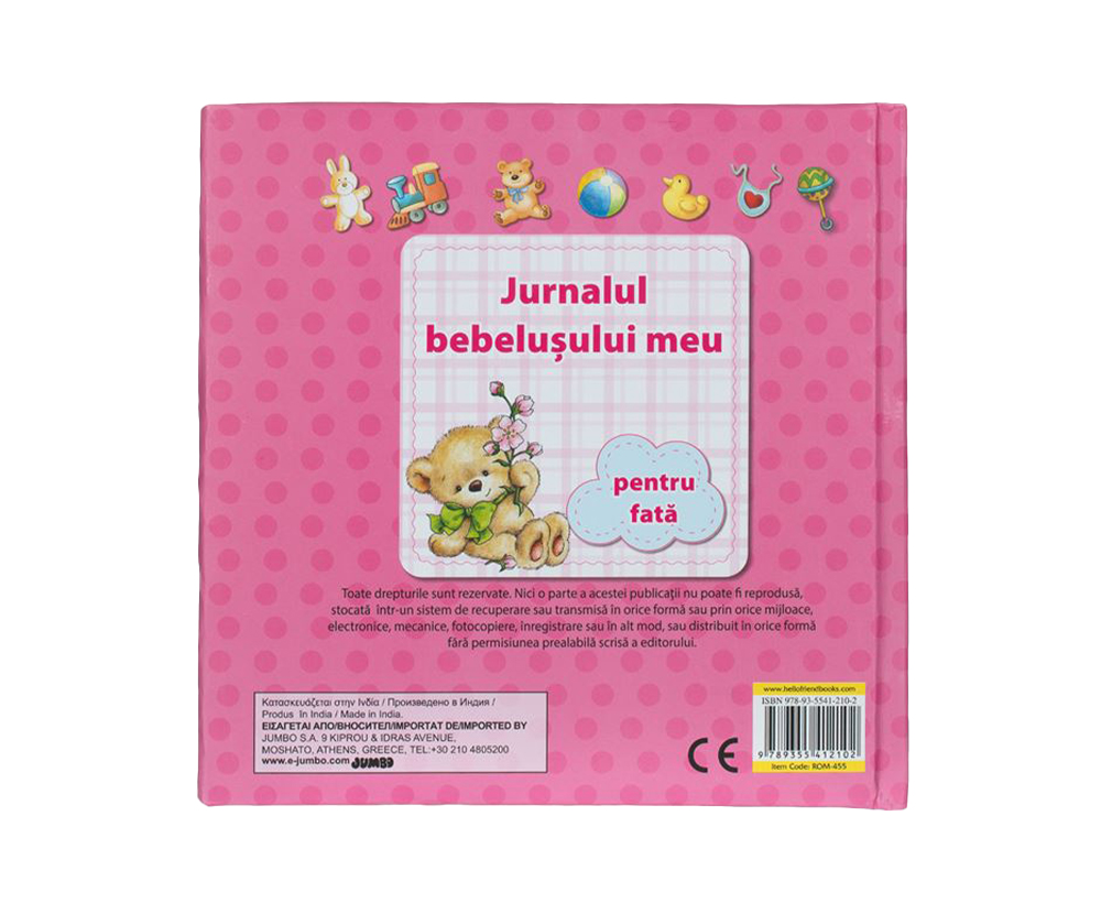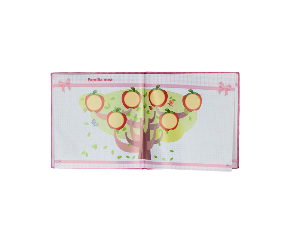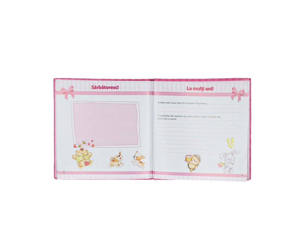 Jurnal cu 16 pagini pentru a trece evenimentele importante din viata bebelusului dumneavoastra. Jurnalul are spatii pentru a lipi imagini, a descrie evenimente, a nota caracteristici, etc. Cateva sectiuni orientative sunt: arborele genealogic, biografie, noteaza-mi progresul etc. Dimensiunile jurnalului sunt de 23.5x30cm si coperta cu glitter.
