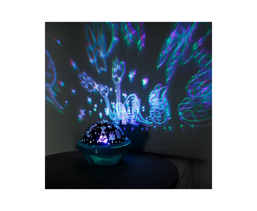 Proiector de camera cu dinozauri si 3 moduri: proiectie fixa cu lumina galbena, proiectie fixa cu lumina colorata (RGB) si proiectie fixa cu lumina galbena si colorata (RGB). Functioneaza cu 3 baterii AA (nu sunt incluse).
