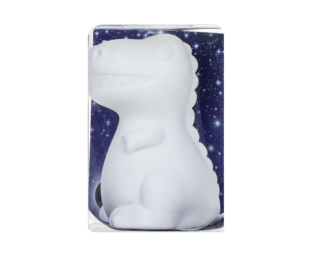 Lampa de veghe cu baterii in forma de dinozaur, de culoare alba, cu lumina fixa. Are un buton de pornire/oprire. Functioneaza cu 3 baterii LR44 (incluse).