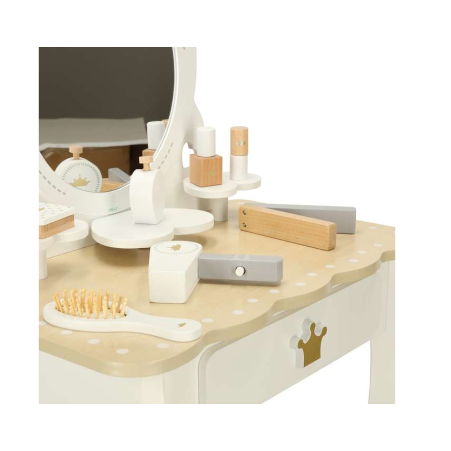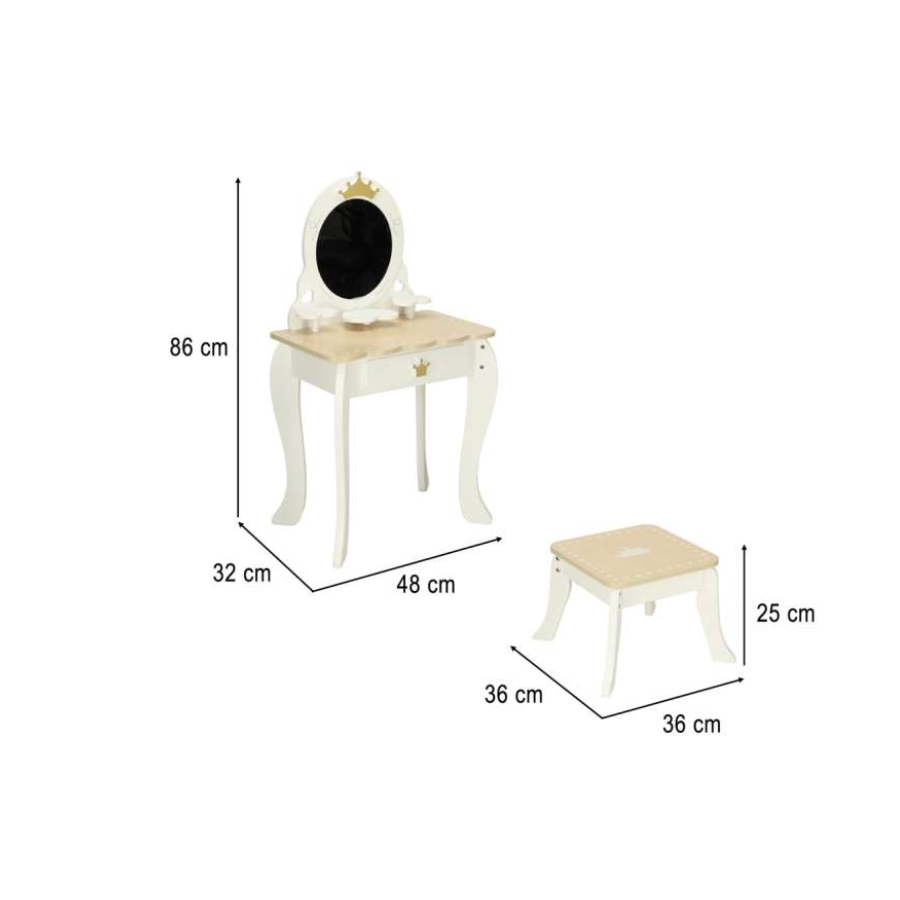 Transforma visul micutei tale in realitate cu aceasta masuta de toaleta pentru copii, perfecta pentru jocul de rol si dezvoltarea creativitatii! Aceasta masa de toaleta eleganta include un oglinda sigura pentru copii, un sertar pentru depozitare si un set complet de accesorii pentru ingrijire si infrumusetare.
