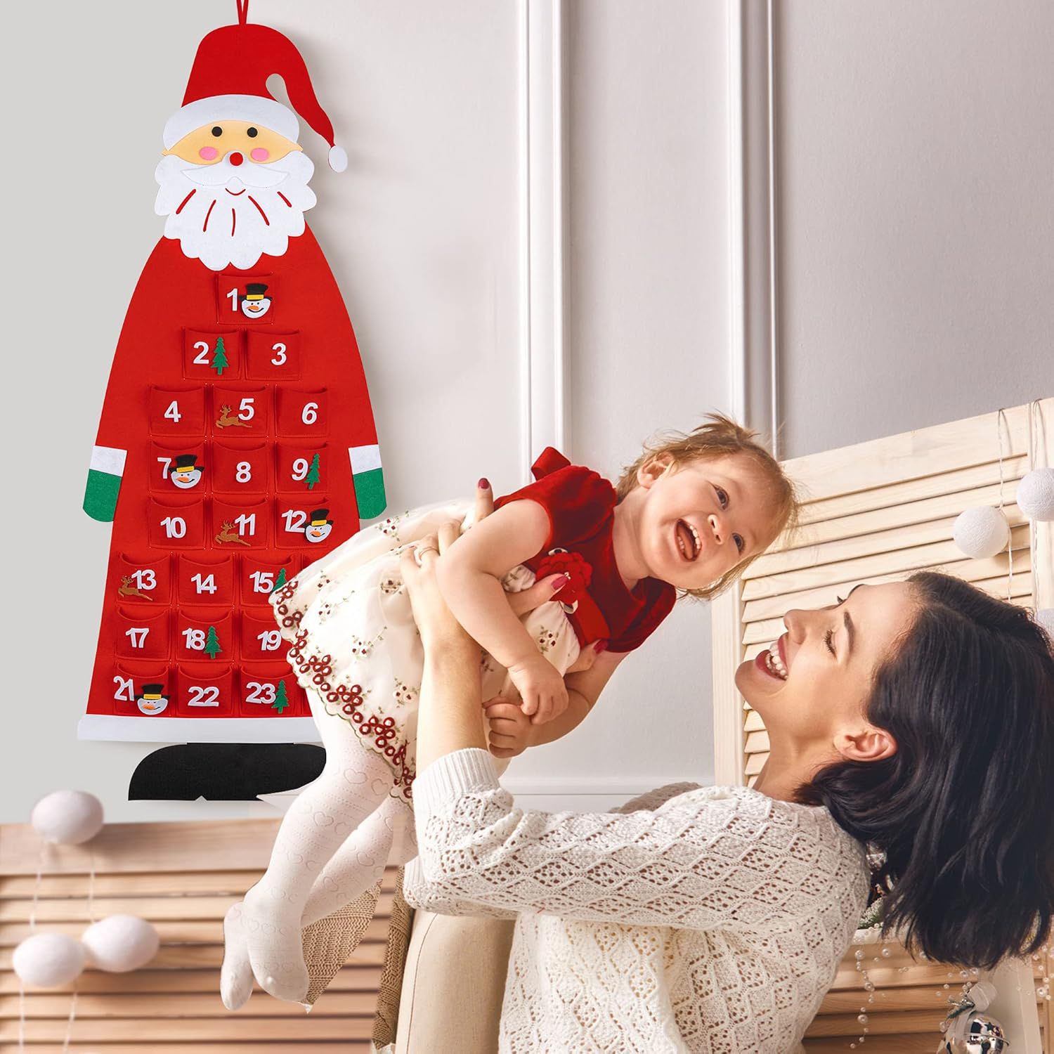 Realizat din pasla durabila, acest calendar este sigur pentru copii si usor de utilizat. Buzunarele incapatoare pot fi umplute cu dulciuri, mici cadouri sau mesaje personalizate, oferind o experienta unica fiecarui membru al familiei.