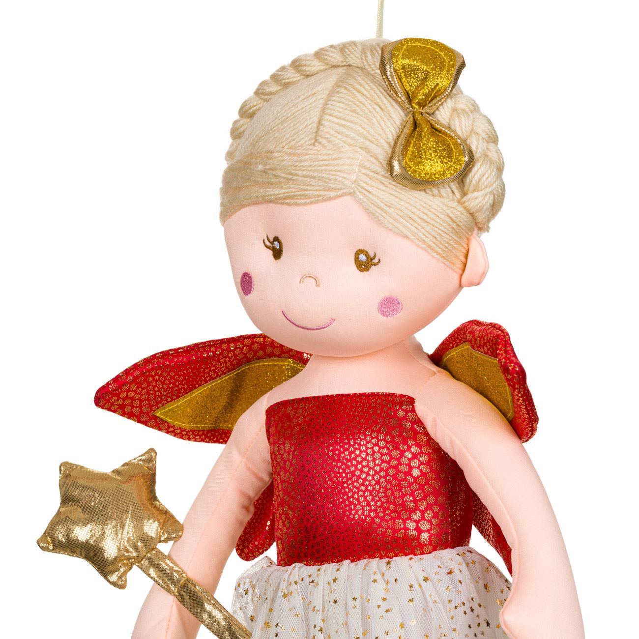 Fiecare detaliu al papusii este realizat cu mare grija. Parul blond al papusii este prins intr-o coafura draguta, decorata cu o fundita aurie delicata. Aripile mari, rosu-aurii, adauga un plus de farmec, iar bagheta aurie pe care o tine in mana subliniaza rolul de ingerus protector. Pantofiorii rosii stralucitori completeaza perfect tinuta, conferindu-i un aspect festiv. Materialele folosite, plasticul si stofa, asigura durabilitate, iar texturile fine ofera o experienta placuta la atingere.