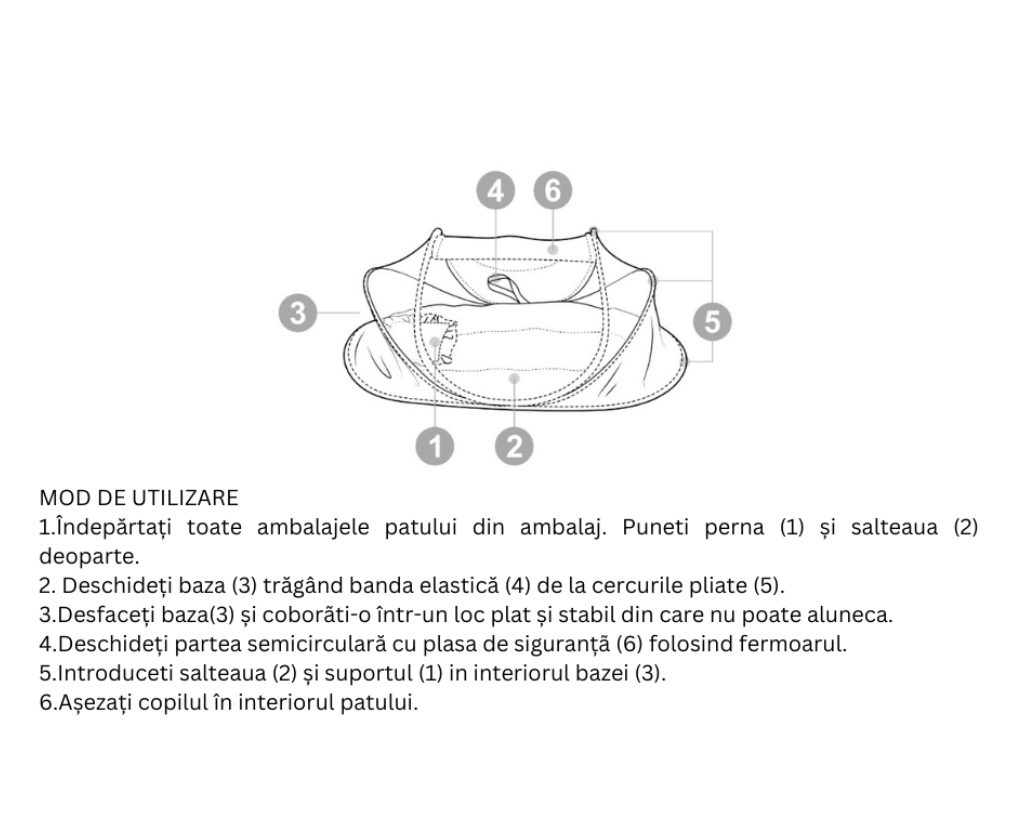 Pentru a asigura o utilizare sigura, este recomandat ca patutul pliabil sa fie plasat pe o suprafata stabila si plana. Evitati plasarea in apropierea obiectelor periculoase si supravegheati intotdeauna copilul in timpul utilizarii.