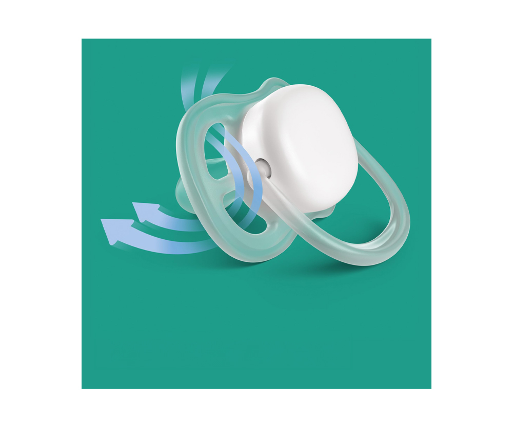 Calmeaza cu confortul aerului. Suzeta Philips Avent ultra air are orificii de aerisire foarte mari pentru a mentine pielea bebelusului uscata. Disponibil in diferite culori si modele.