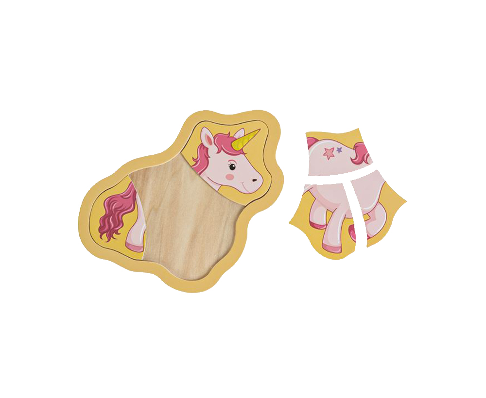 Puzzle din lemn cu 5 piese cu model de unicorn.