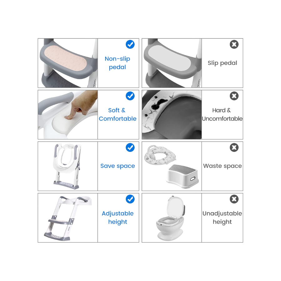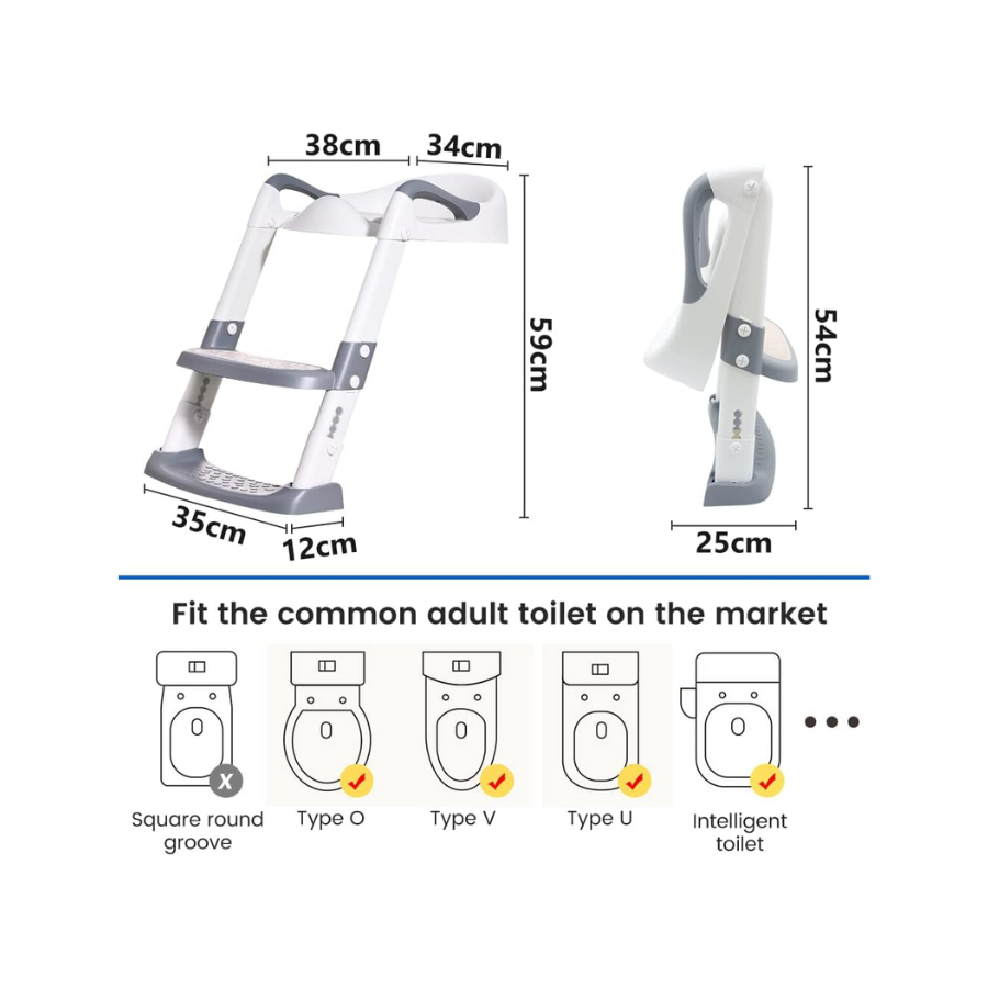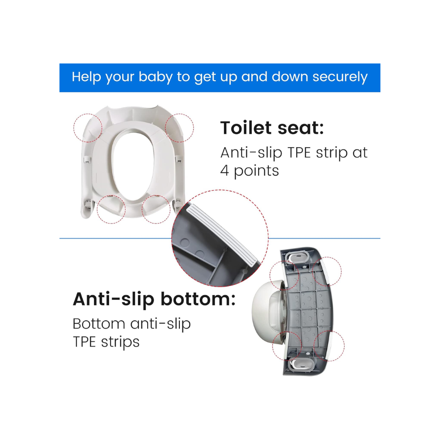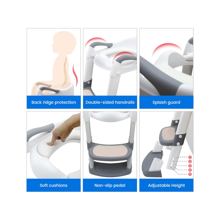 Cu manere duble ergonomice si o treapta lata antialunecare, copilul poate urca si cobori in siguranta, dezvoltandu-si treptat independenta. Protectia pentru spate si sistemul anti-stropire pentru baieti adauga un plus de confort si igiena. In plus, designul rabatabil permite plierea usoara pentru depozitare compacta dupa utilizare.