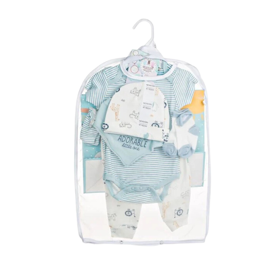 AAcest set cadou pentru baieti, fabricat din bumbac moale, contine tot ce este necesar pentru a imbraca un nou-nascut in primele sale zile. Setul include 8 piese esentiale pentru confortul si stilul micutului. Un body cu maneci scurte si dungi albastre, pantaloni albi cu design cu animale din jungla, o caciulita asortata, o bavetica albastra cu imprimeu "Adorable Little One", manusi si sosete. Fiecare piesa este atent realizata pentru a asigura confort si mobilitate, oferind libertate de miscare pentru cel mic.