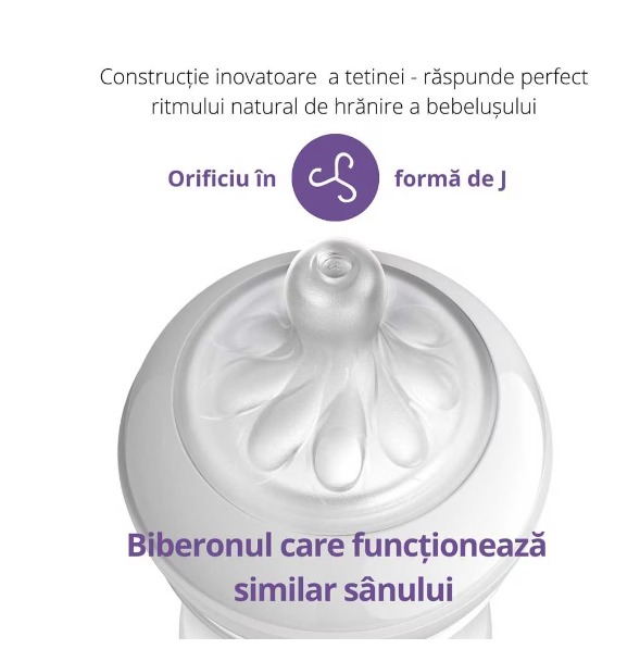 Tetina larga si flexibila imita forma sanului, incurajand bebelusul sa se ataseze si sa suga in mod natural. Acest lucru ajuta la reducerea confuziei dintre san si biberon, astfel incat parintii sa poata alterna intre hranirea naturala si cea cu biberonul fara dificultati.