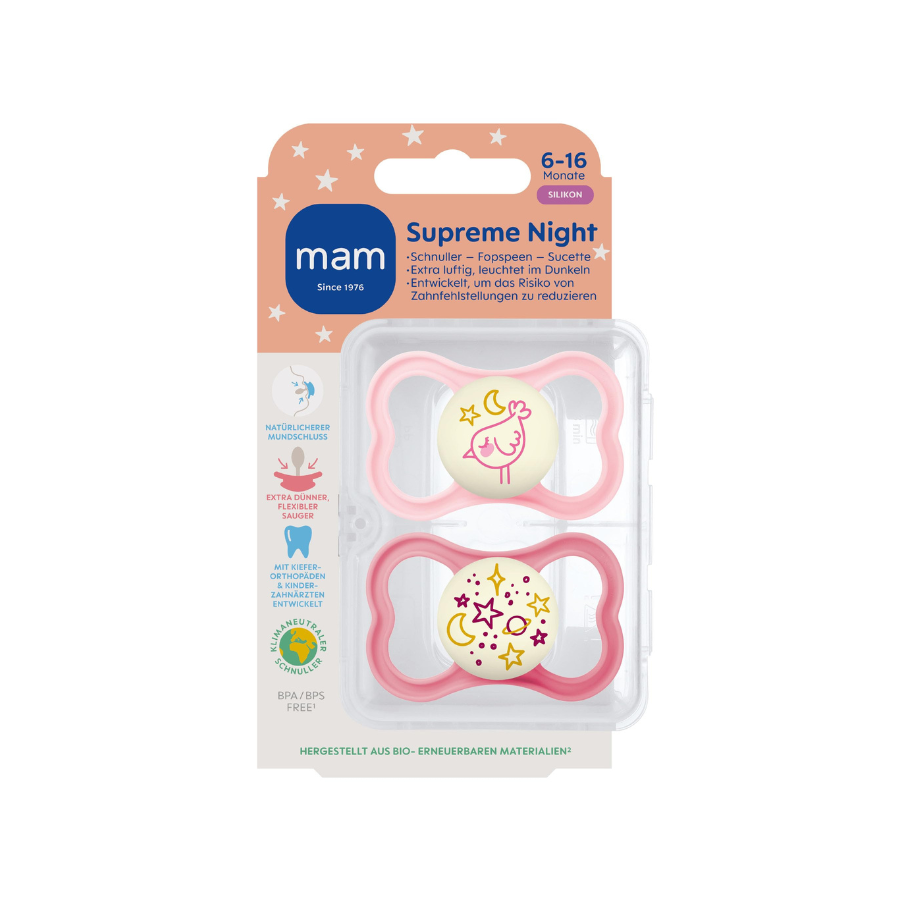 Set suzete MAM Supreme Night este special conceput pentru bebelusii cu varsta intre 6 si 16 luni, oferind un confort maxim si un design inovator. Aceste suzete nu doar ca ajuta la calmarea bebelusului, dar sprijina si dezvoltarea sanatoasa a cavitatii bucale, datorita tetinei ultra-subtiri si flexibile.