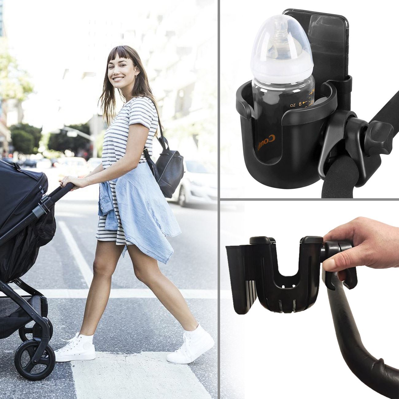 Suportul este conceput pentru a se potrivi pe carucioare cu maner plat sau rotund, avand un diametru ajustabil intre 2 si 4.5 cm. Aceasta versatilitate face suportul pentru pahar si telefon potrivit pentru o gama larga de carucioare, biciclete sau chiar motociclete. Indiferent daca doriti sa transportati o sticla de apa, un biberon sau o cana de cafea. Acest suport este solutia ideala pentru a le avea mereu la indemana.