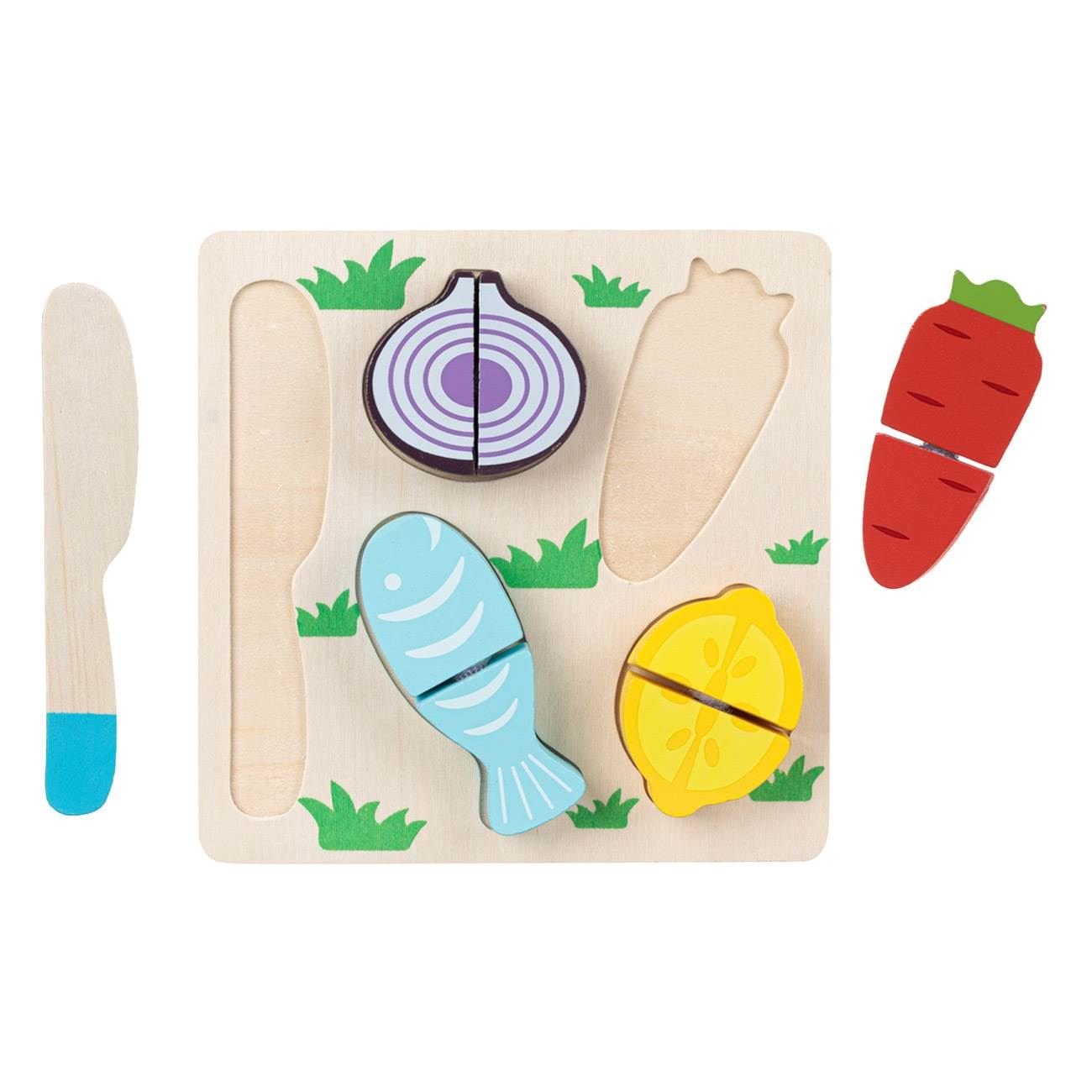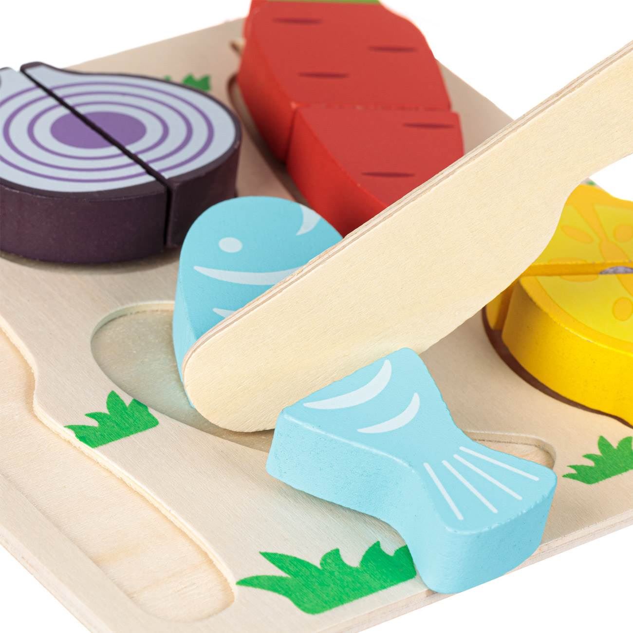 Setul contine 5 piese din lemn de calitate. Include legume colorate – morcov, ceapa, lamaie – si un peste, toate cu un design realist. Fiecare piesa este prevazuta cu banda adeziva cu scai, permitand copilului sa „taie” ingredientele in mod repetat. In plus, cutitul din lemn este sigur si usor de folosit de catre copii.