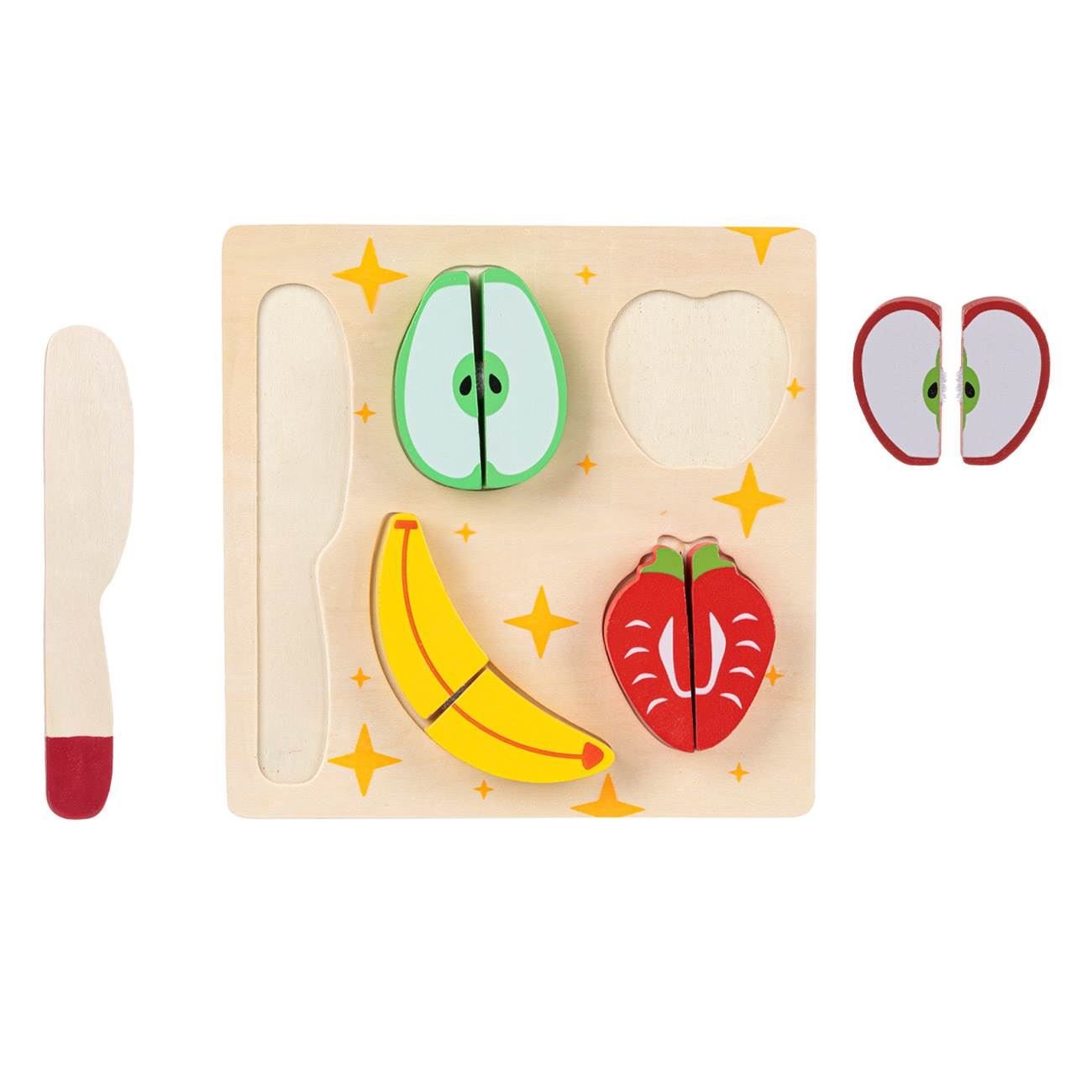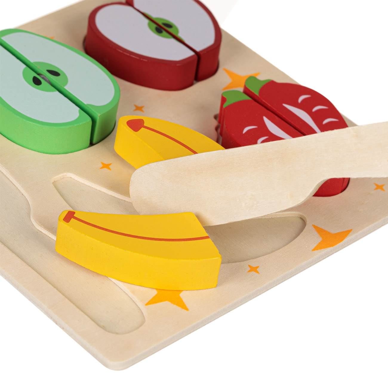 Acest set tocator de jucarie din lemn este perfect pentru micii bucatari care vor sa exploreze lumea prepararii fructelor. Setul include 5 piese – un tocator, un cutit din lemn si patru fructe (banana, capsuna, mar, para). Fiecare dintre ele fiind feliabile datorita scaiului de la mijloc. Copiii pot folosi cutitul de lemn pentru a "taia" fructele, apoi le pot pune inapoi impreuna, exersandu-si abilitatile motorii si coordonarea mana-ochi.