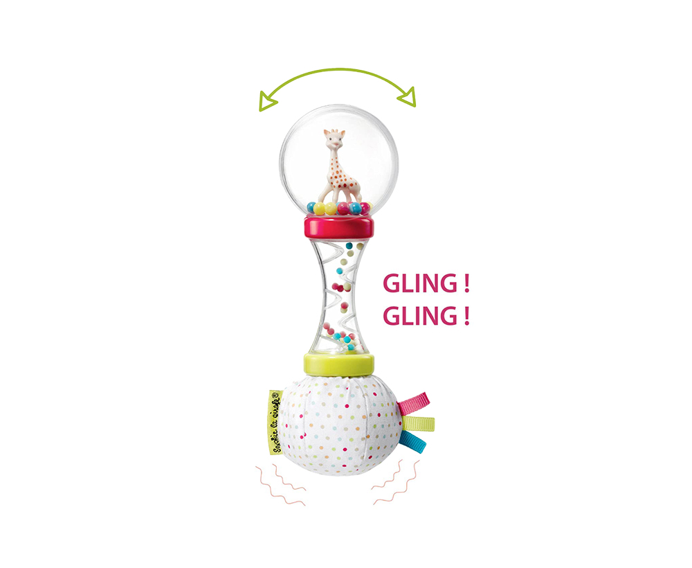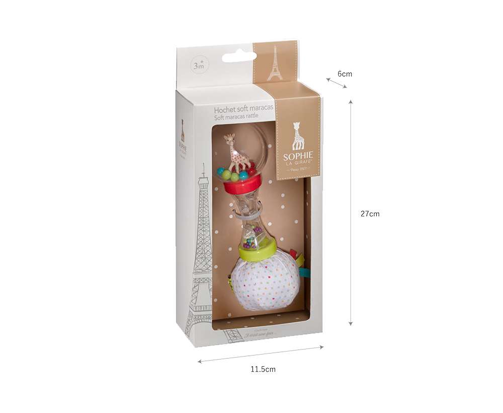 Veți primi (1) Sophie la Girafe Soft Maracas Rattle. Un baston plin cu bile colorate care se rotesc în jurul lui Sophie la girafe și hârtie crocantă pe cealaltă parte! Bebelușul tău va adora să agite această jucărie înainte și înapoi pentru a urmări și asculta toate caracteristicile sale! Ușor de prins în mijloc, cu culori care vor captiva atenția bebelușului tău. O jucărie de agitare adorabilă, cu multe descoperiri interesante pentru bebeluș.